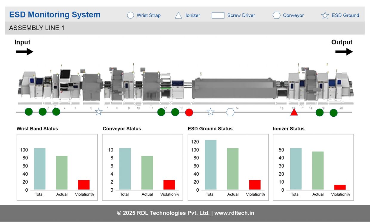 Online Live ESD Monitoring System, a good tool to measure the effectiveness of an ESD compliance and its efficacy in improving yield, provides 100% monitoring for both the operator and the work surface. This unit provides continuous monitoring of user wearing a wrist strap and also functions to ensure the grounding integrity of ESD protected work surfaces. This device will continuously monitor the user until the wrist strap or work surface becomes dysfunctional or unsafe according to accepted industry standards (S20.20-2014/IEC 61340-5-1), at which point the monitor will issue an audible signal notifying the user of a problem. The ESD Online Continuous Monitoring System also verifies whether an outlet ground is good or bad.